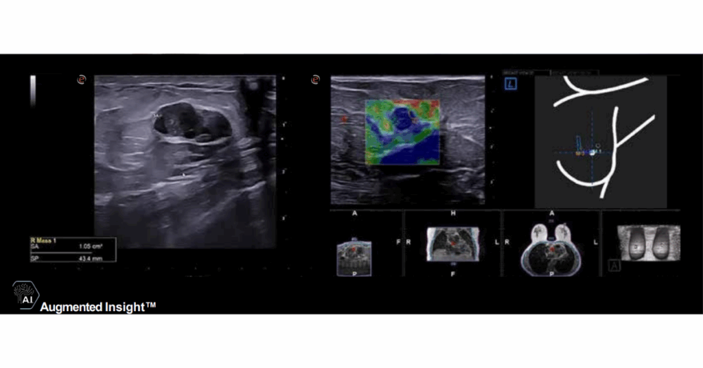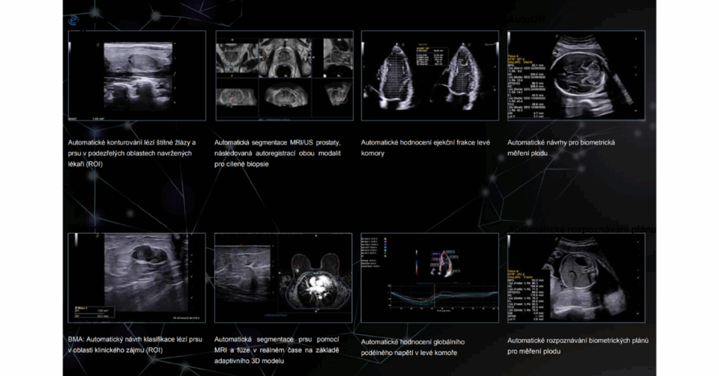- 3D modelovaná AI technologie – umožňuje fúzní zobrazení mezi MRI a ultrazvukem a poskytuje automatickou podporu při segmentaci prsu.